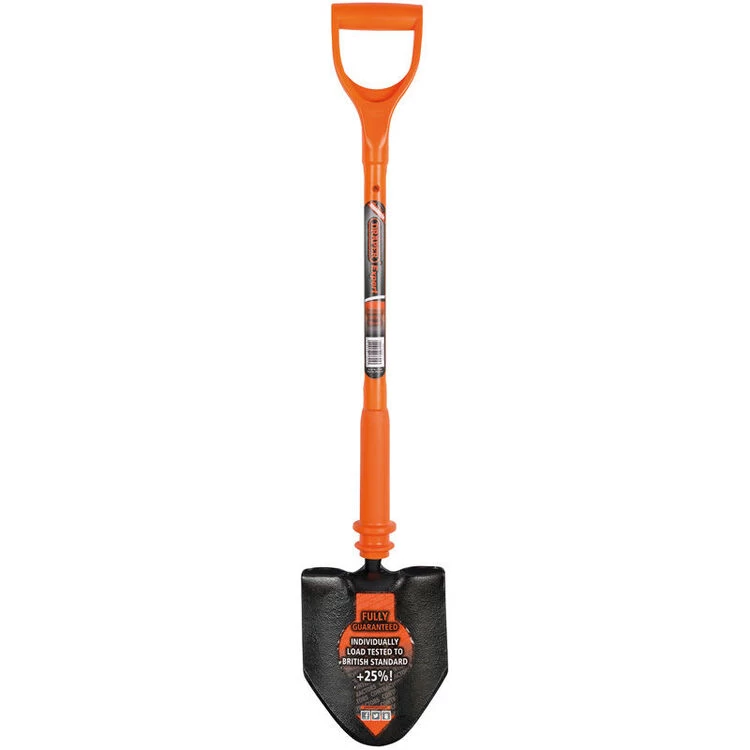 Expert Quality, fully insulated utility shovel designed for working on or near live cable and wires. Individually tested to 10,000 volts, guaranteeing safe working on 1,000V and complying to the BS 8020: 2011 standards. Manufactured with an epoxy fibreglass core and attached to a fully enclosed insulated shaft with hand slip guard. Each shovel is supplied with a certificate of conformity, which correlates with a unique traceability number embossed on the shaft. Sold loose.