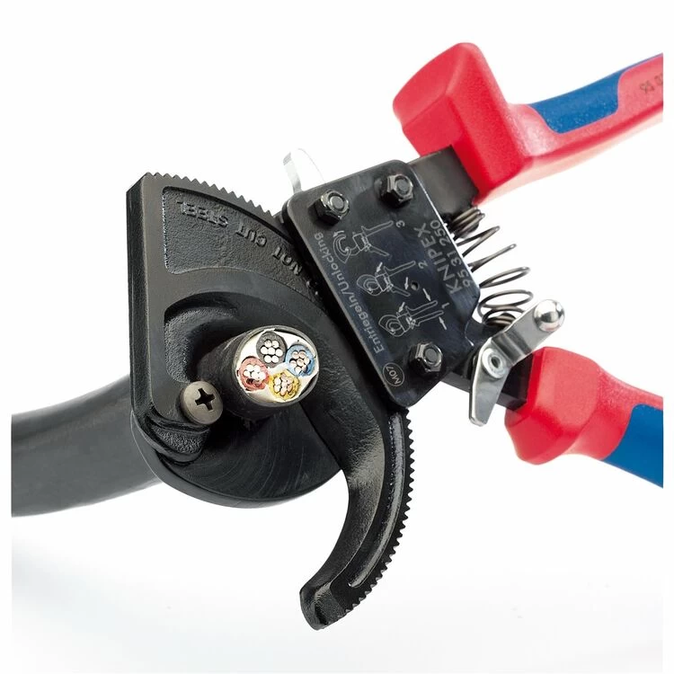 Professional Quality, forged from special grade tool steel, hardened and tempered. Smoothly ground head with cutting edges precision ground and hardened. One hand operation with two-stage ratchet drive for easy cutting without crushing cables. Can be used for wire stripping. 280mm long model will also cut 4 x 150mm² aluminium cable. Heavy duty moulded handles and slip guards for extra safety and comfort. Sold loose.