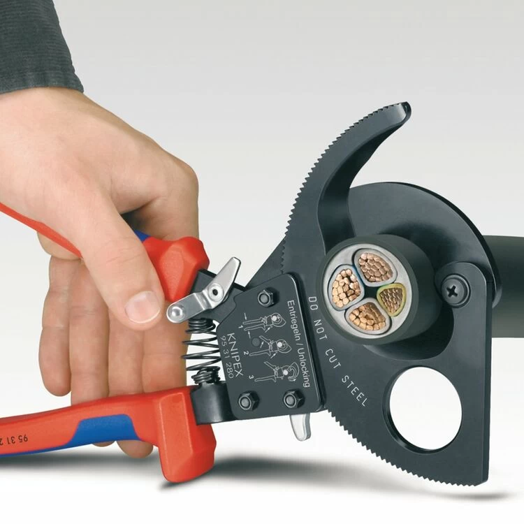 Professional Quality, forged from special grade tool steel, hardened and tempered. Smoothly ground head with cutting edges precision ground and hardened. One hand operation with two-stage ratchet drive for easy cutting without crushing cables. Can be used for wire stripping. 280mm long model will also cut 4 x 150mm² aluminium cable. Heavy duty moulded handles and slip guards for extra safety and comfort. Sold loose.