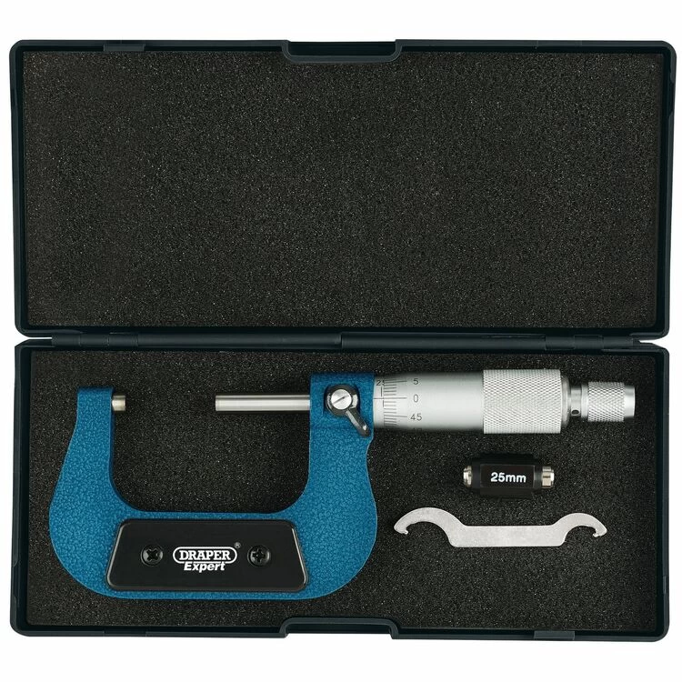 Expert Quality, with enamelled frame, heat plates, satin chrome thimble and sleeve. Graduations 0.01mm. Carbide tipped anvils, lock and ratchet stop. Supplied in plastic storage case and display packed.