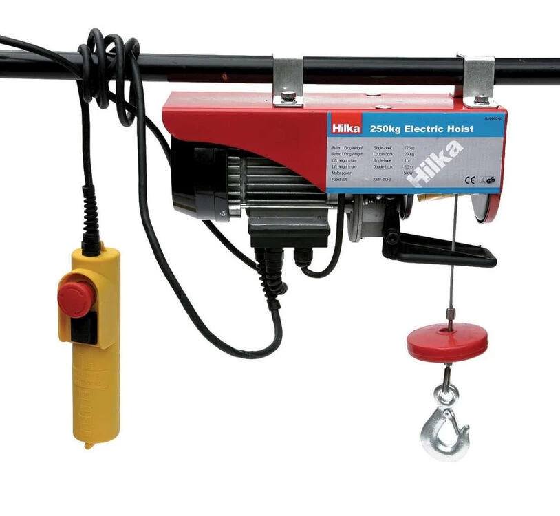 250kg maximum capacity electric hoist with pulley and remote lifting control. Support brackets supplied. 125kg capacity without pulley, 250kg with. Lifting height 10m without pulley 5m with pulley. Specifically designed for lifting applications around the job site, shop, barn or home. Emergency stop button built into control switch for safety. International protection rated IP54, can be used outside but not in rain.