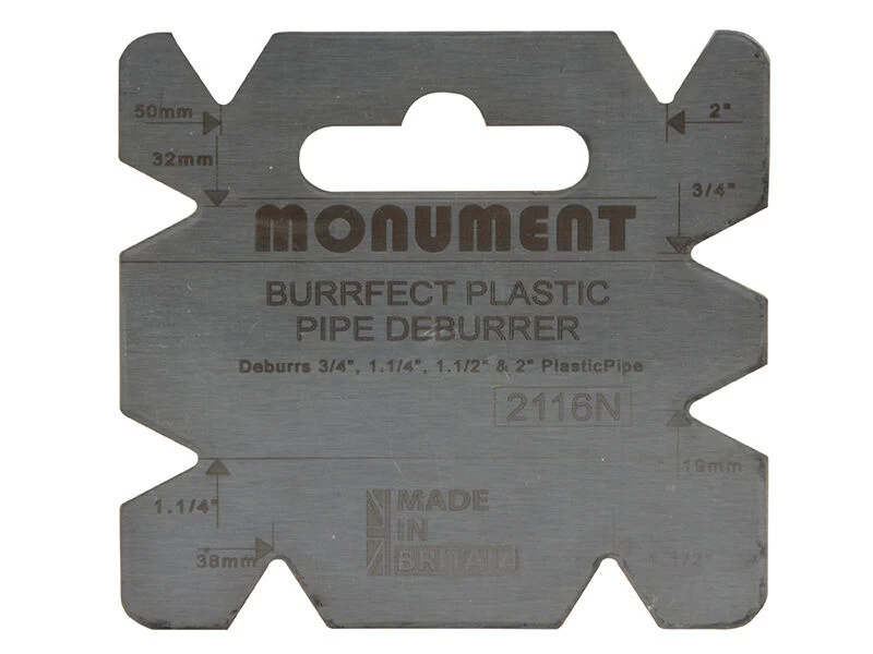 This Monument 2116N Burrfect® Square Deburrer cleans and deburrs 4 different sizes of plastic waste pipe, it is a high quality metal square with each side de-burring a different size of plastic pipe.