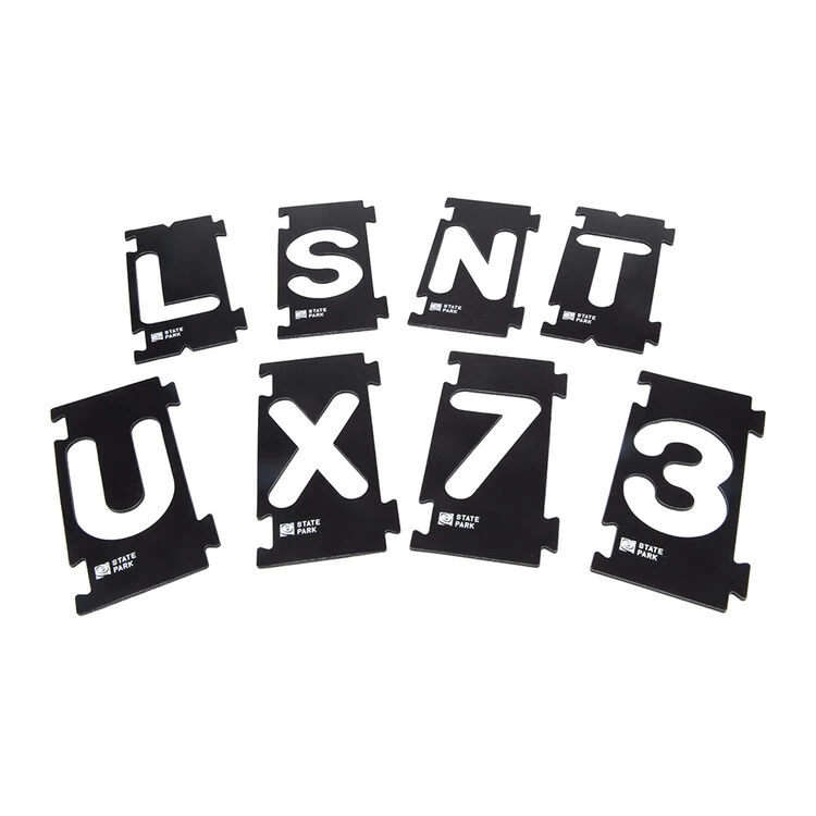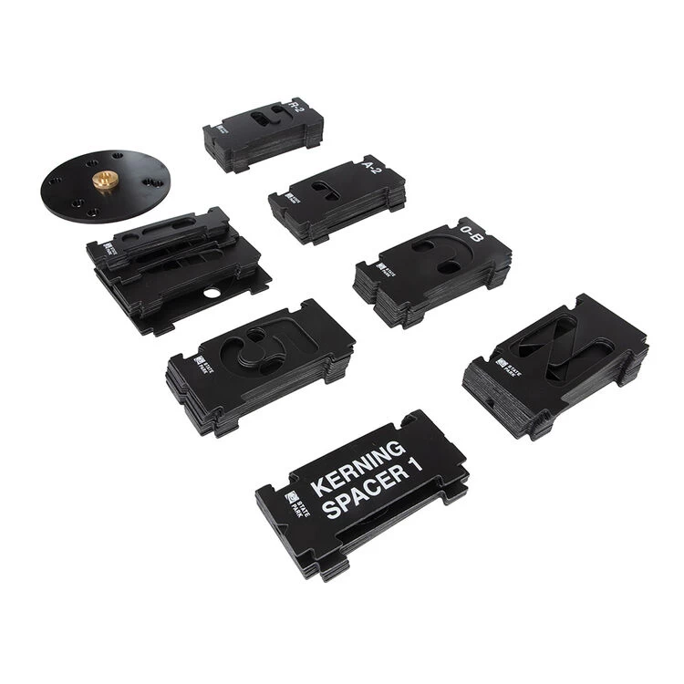 Produces professional signs using templates and a router. Templates interlock and are mounted using painter tape. Adjustable kerning allows neat, even spacing between letters. Includes 99 template pieces including letters, numbers, symbols, and kerning spacers. Also includes a high-quality brass guide bushing and a universal router base to fit all Triton routers. Template thickness 2mm (3/32″). Available in 1-1/2″, 2-1/4″ and 3-3/8″ sizes. Compatible with Rockler Sign Router Bits (sold separately), as follows: 1-1/2” compatible with 3/16” Sign Router Bit, 2-1/4” compatible with 3/8” Sign Router Bit, 3-3/8” compatible with 5/8” Sign Router Bit.