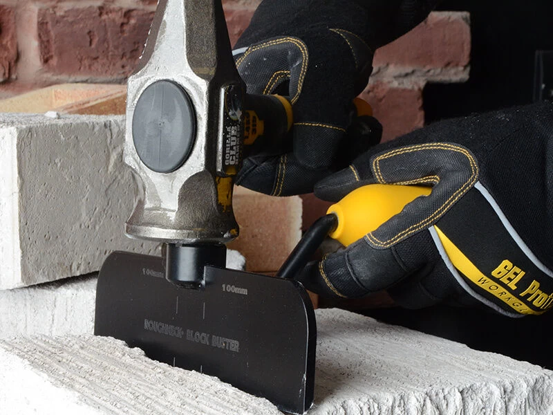 The Roughneck Gorilla Block Buster™ Bolster is a unique tool designed to cut blocks and bricks quickly, safely and accurately. It can also be used for removing wall or floor tiles, outside wall rendering as well as chasing out channels in block work for recessed pipes and cables.