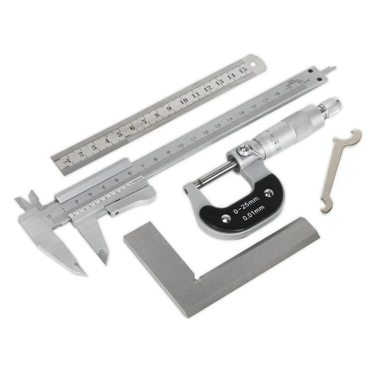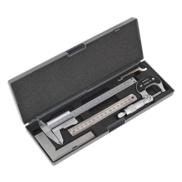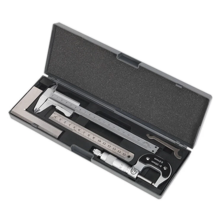 • Contents: 200mm Vernier Caliper, 0-25mm Micrometer, 100 x 70mm Bevelled Edge Square, 150mm(6″) Stainless Steel Rule.