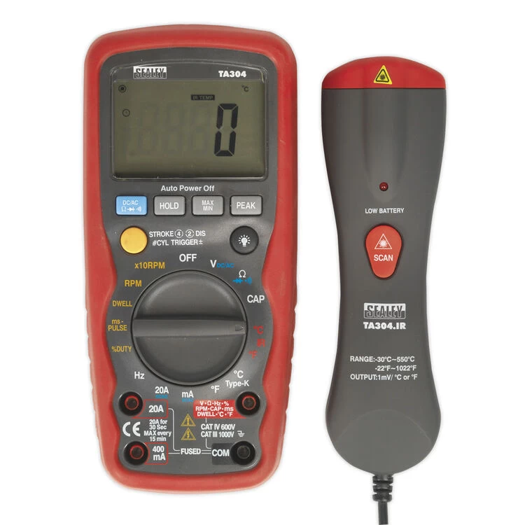 • 15-Function, auto-ranging automotive diagnostic multimeter with infrared thermometer attachment.