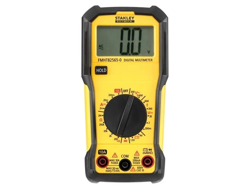 The Stanley Intelli Tools FatMax® Basic Digital Multimeter is highly reliable with a compact, handheld design. Contains all the necessary features to measure DC and AC voltage, DC current, resistance, battery voltage, diodes and forin-circuit continuity test. A manual function and range switch allows you to select different functions/ranges. A ‘Hold’ button allows you to hold the last measured reading. It has a 3.5in LCD display and is encased in a robust housing with anti-drop performance.