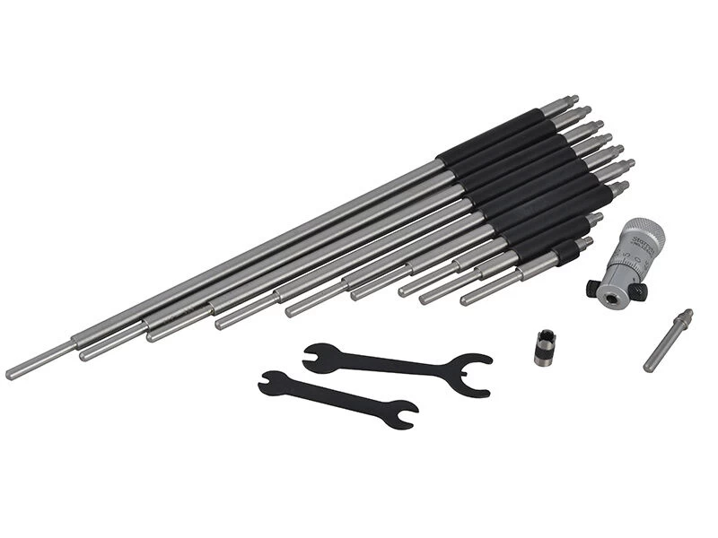 Lightweight and ideal for measuring inside diameters, the rods are solid, insulated and assembled on one side of the micrometer head. Anvils on rods are adjustable for length. Rod and anvils are hardened and ground.
